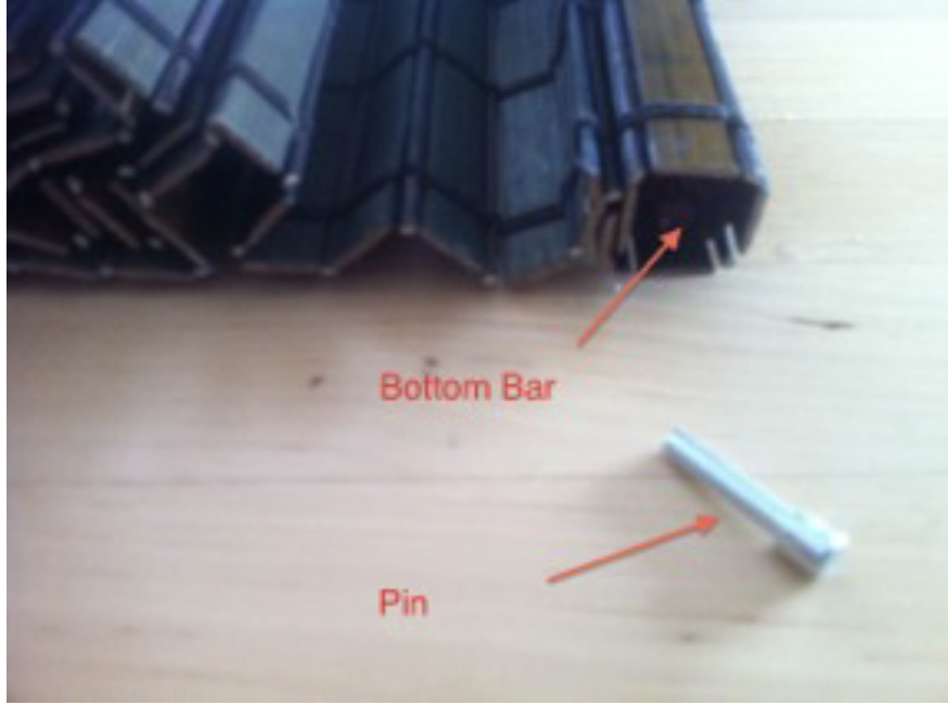 3. Drill a hole in the center of the bottom bar. A 9/64 drill bit should provide a good, tight fit. The narrow end of the pin should be inserted into the bottom bar.