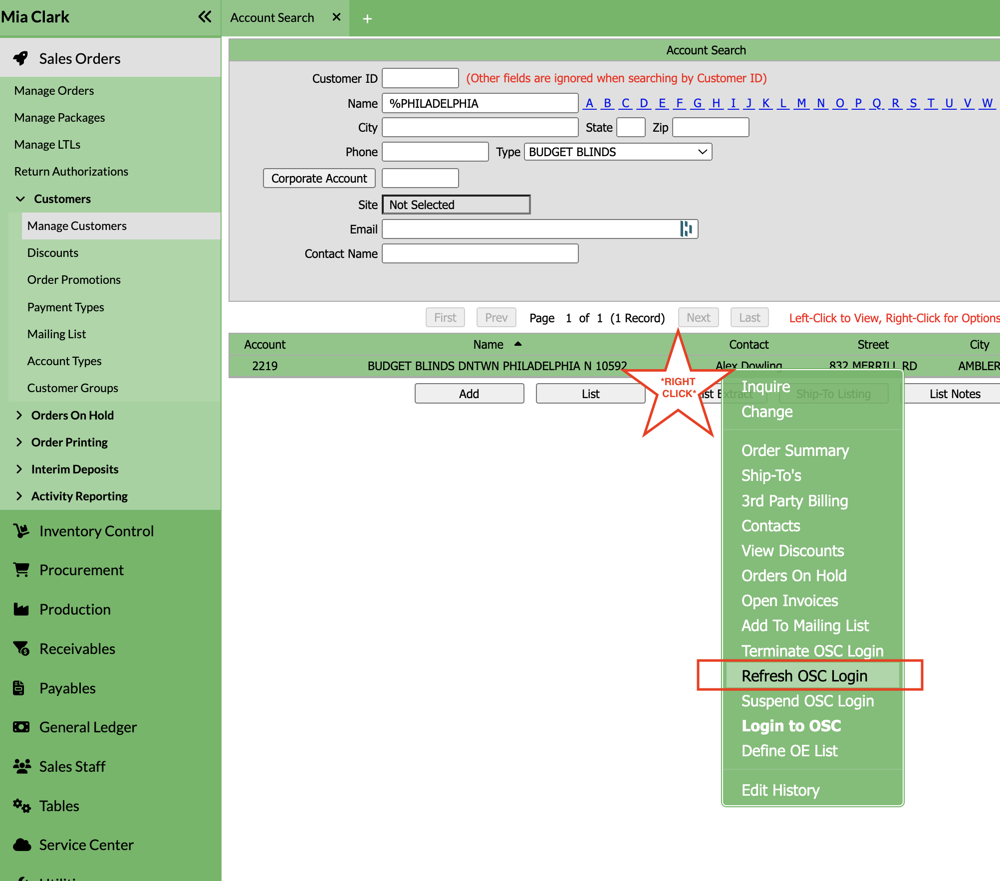 3. Right click on the customer's account, and then click 'Refresh OSC Login'. The customer should receive a reset for their password. The temporary password is valid for 24 hours. Let the customer know that they should type this password, not copy and paste, as that doesn't work with PIC.