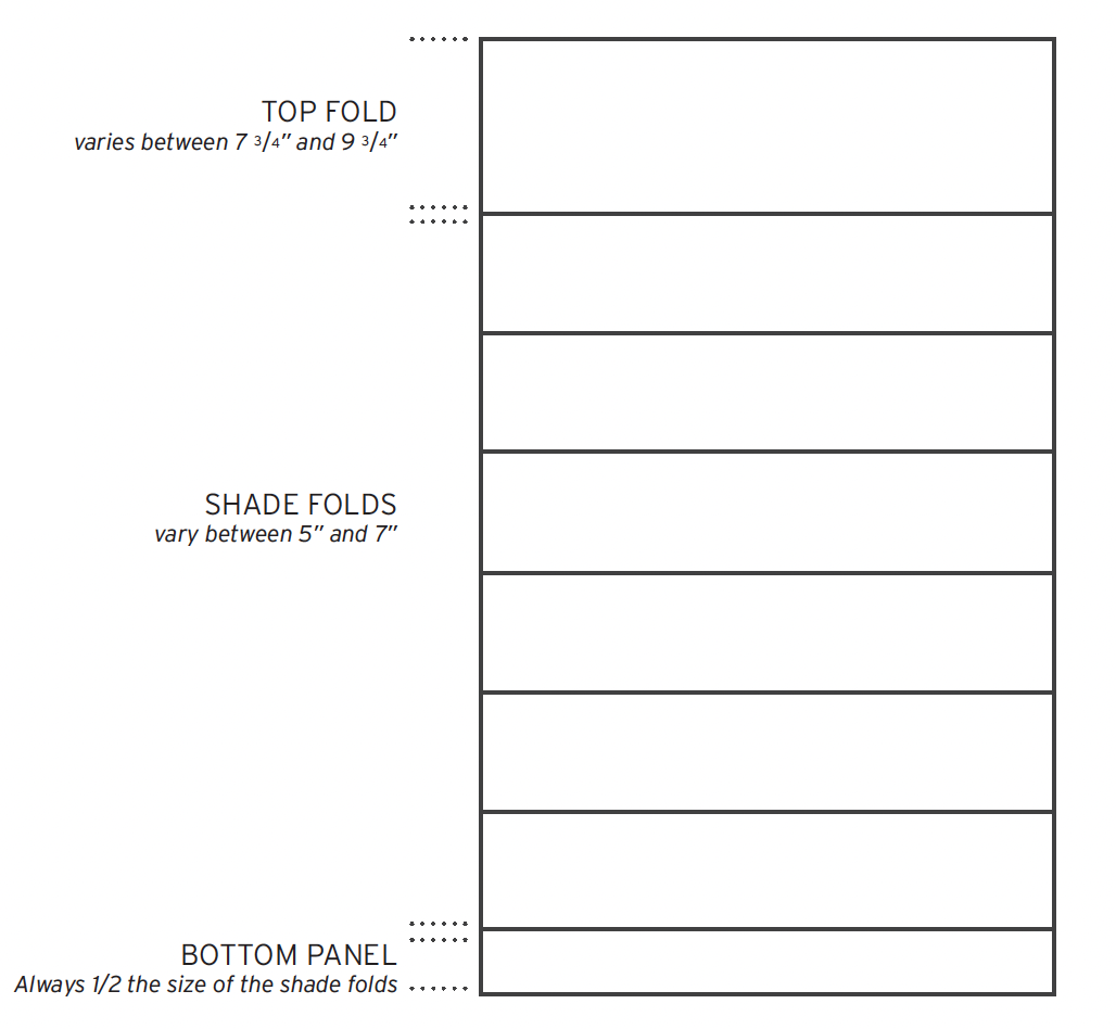 - The bottom panel will always be 1/2 the spacing of the shade folds. The top panel varies based on the length of the shade between 7 3/4” and 9 3/4”.
