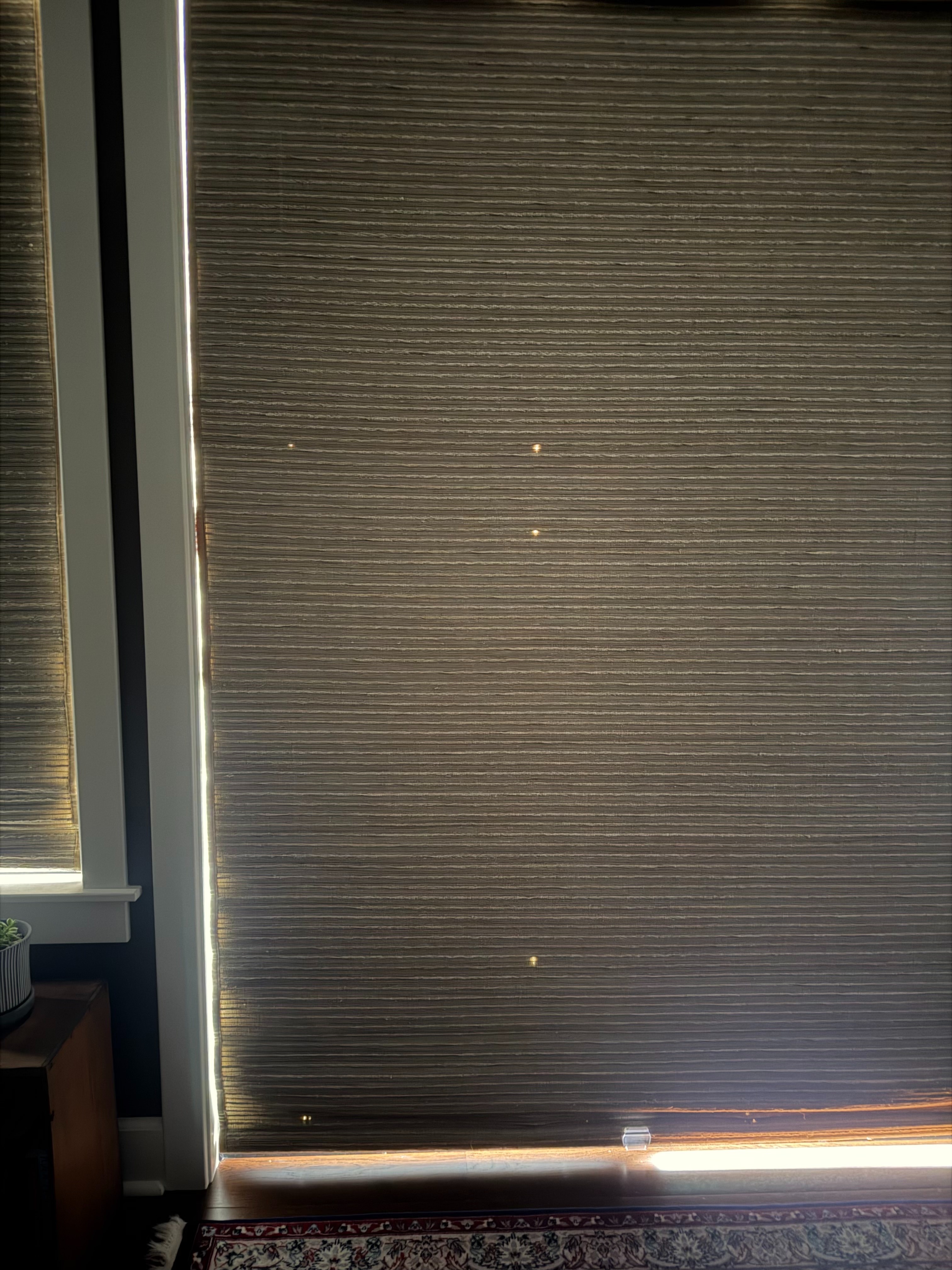 This is caused by the cord of the shade rubbing against the liner, causing friction. This is common when mounted to things like doors, where the fabric is pressed right up to the glass, increasing the likelihood that the cords are contacting the liner.